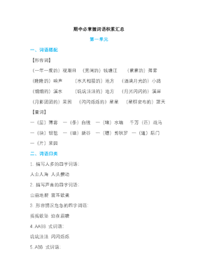 期中必掌握词语积累汇总 第一单元 一、词语搭配 【形容词】 (一年一度的)观潮日(宽阔的)钱塘江 (蒙蒙的)薄雾 (隆隆的)响声 (水天相接的)地方 (洒满月光的)小路 (细细的)溪水 (坑坑洼洼的)地方 (月光闪闪的)溪岸 (月影团团的)果园 (闪闪烁烁的)星星 (星群密布的)蓝天 【量词】 一(层)薄雾 一(条)白线 一(堵)水墙千万(匹)战马 一(块)银毯 一(塘)新谷 一(穗)剪秋罗一(道)后门 一(片)菜园二、词语归类 1. 描写人多的四字词语: 人山人海 人头攒动 2. 描写声音的四字词语: 山崩地裂 震耳欲聋3. 形容情况危急的四字词语: 摇摇欲坠 迫在眉睫 4. AABB 式词语: 坑坑洼洼 闪闪烁烁 5. ABB 式词语: 滴溜溜 孤零零 空荡荡 6.半× 半×式词语: 半明半昧 半信半疑 第二单元 一、词语搭配 【形容词】 (温暖)的阳光(愉快)的想象(盛开)的豌豆花 (漆黑)的夜里(极细)的电线(敏锐)的眼睛 (美好)的愿望(轻盈)的身体(素洁)的彩粉 (出乎意料)的发现 (呼风唤雨的)世纪 (黑暗无光的)世界 (腾云驾雾的)神仙 【副词】 (灵巧)地避开(欢快)地坐着(焦急)地询问 【量词】 一(个)豆荚一(粒)豌豆 一(个)囚犯 一(块)旧板子 一(根)绳子一(片)叶子 一(只)鸽子 一(个)小花园 一(架)飞机一(根)电线 一(次)试验 一(个)世纪 一(个)神话一(个)奇迹 二、词语归类 ABB 式词语: 暖洋洋 红艳艳 水灵灵 黑压压 水淋淋 含有数字的四字词语: 横七竖八 隔三岔五 五光十色 九牛一毛 七上八下 含有近义词的四字词语: 呼风唤雨 腾云驾雾 察言观色 安邦定国 见多识广 三、关联词 1.它一边飞,一边从嘴里发出声音。 2.即使一根极细的电线,它也能灵巧地避开。 3.蝙蝠夜里飞行,靠的不是眼睛,而是用嘴和耳朵配合起来探路的。 4.那是没有电灯,没有电视,没有收音机,也没有汽车。 5.蝴蝶一看下雨,就飞到人们冒着炊烟的屋檐下避雨。第三单元 一、词语搭配 【形容词】 (临时)的隐蔽所(温和)的阳光(舒服)的住宅 (倾斜)的隧道(伟大)的工程 (嫩绿)的叶子 【副词】 (慎重地)选择(倾斜地)铺开 (轻微地)摆动 【量词】 一(道)残阳一(阵)风一(根)细丝一(条)隧道 一(丛)草两(排)锯两(个)钟头两(寸)深 二、词语归类 1. 四字词语:引人注意 毫不可惜 随遇而安 2. 两个字表示同一个意思的词:均匀 3. AABB 式词语:弯弯曲曲 三、关联词 1.爬山虎的脚要是没触着墙,不几天就萎了,后来连痕迹也没有了。2.它的出名不光由于它的唱歌,还由于它的住宅。 3.即使有骤雨,这里也立刻就会干的。 4.如果感到疲劳,它就在未完工的家门口休息一会儿。第四单元 一、词语搭配 【动词】 (照耀)大地(拿取)火种(喷射)火焰(烧熟)食物 (驱赶)猛兽(承认)错误(归还)火种(忍受)痛苦 (违抗)命令(啄食)肝脏(获得)自由 【形容词】 (巍峨的)巨人(巨大的)变化 (隆隆的)雷声 (辽阔的)大地 (奔流不息的)江河 (茂盛的)花草树木 (滋润万物的)雨露(美丽的)宇宙 (无边的)黑暗(严厉的)惩罚(高高的)悬崖 (凶恶的)鹫鹰 (尖利的)嘴巴(快乐幸福的)生活 (五彩的)云霞 【副词】 (坚定地)回答 【量词】 一(片)混沌一(条)缝一(丝)微光一(声)巨响 一(根)柱子一(位)天神一(颗)火星一(只)鹫鹰 一(阵)响声一(道)深沟一(眼)泉水一(场)雨 二、词语归类 1. 含有天地的四字词语:开天辟地 顶天立地 2. 形容劳累的四字词语:精疲力竭 筋疲力尽 3. 表示生气的四字词语:愤愤不平 气急败坏 4. ABB 式词语:轰隆隆 哗啦啦 咔嚓嚓 扑棱棱 丁零零 咕噜噜 5. AABC 式词语:熊熊大火 井井有条 默默无闻 生生不息 落落大方 6. AABB 式词语