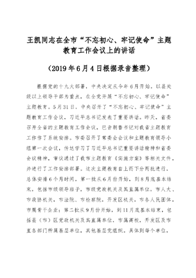 王凯同志在全市“不忘初心、牢记使命”主题教育工作会议上的讲话.docx