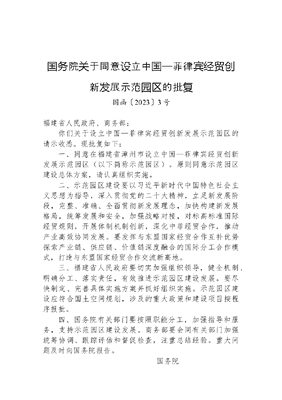 国务院关于同意设立中国—菲律宾经贸创新发展示范园区的批复.docx