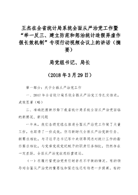 王杰在全省统计局系统全面从严治党工作暨“举一反三、建立防范和惩治统计造假弄虚作假长效机制”专项行动视频会议上的讲话(摘要).docx