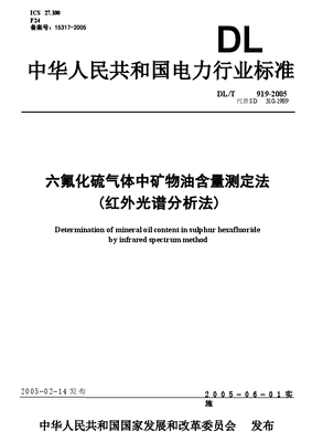 DLT919-2005 六氟化硫气体中矿物油含量测定法(红外光谱分析法).docx