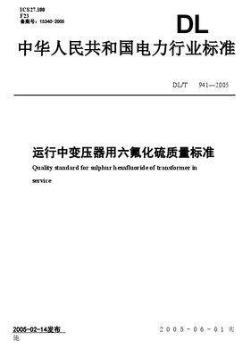 DLT941-2005 运行中变压器用六氟化硫质量标准.doc