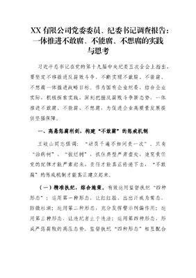 XX有限公司党委委员、纪委书记调查报告:一体推进不敢腐、不能腐、不想腐的实践与思考.docx