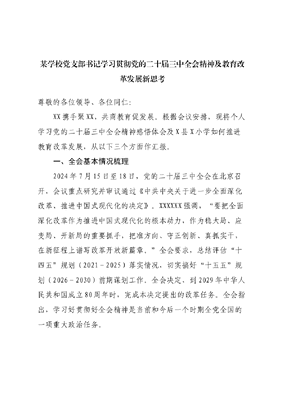 某学校党支部书记学习贯彻党的二十届三中全会精神及教育改革发展新思考.docx