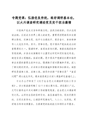 专题党课:弘扬优良传统,练好调研基本功,以大兴调查研究调动党员实干担当激情.docx