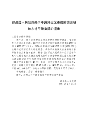 都昌县人民政府关于申请跨设区市统筹调出耕地占补平衡指标的请示.docx