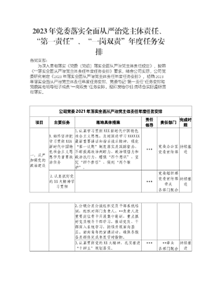 2023年党委落实全面从严治党主体责任、“第一责任”、“一岗双责”年度任务安排.docx