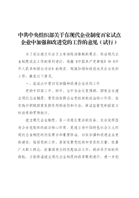 中央组织部关于在现代企业制度百家试点企业中加强和改进党的工作的意见(试行)1996.docx