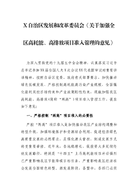 X自治区发展和改革委员会《关于加强全区高耗能、高排放项目准入管理的意见》.docx