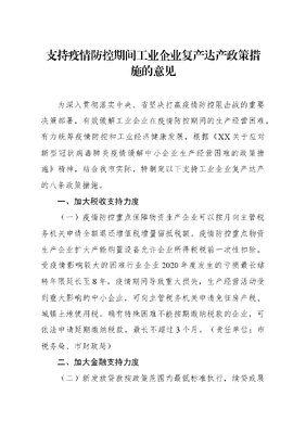 支持疫情防控期间工业企业复产达产政策措施的意见.docx