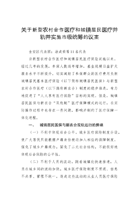 关于新型农村合作医疗和城镇居民医疗并轨并实施市级统筹的议案.docx