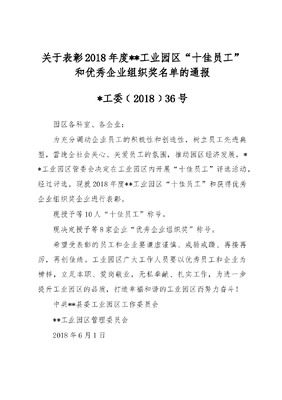 关于表彰2018年度工业园区“十佳员工”和优秀企业组织奖名单的通报.docx