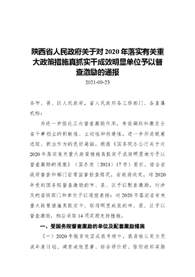 陕西省人民政府关于对2020年落实有关重大政策措施真抓实干成效明显单位予以督查激励的通报.docx