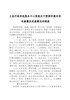 X县行政审批服务中心党组关于营商环境专项巡察整改进展情况的通报.docx