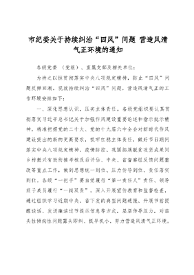市纪委关于持续纠治“四风”问题营造风清气正环境的通知.docx