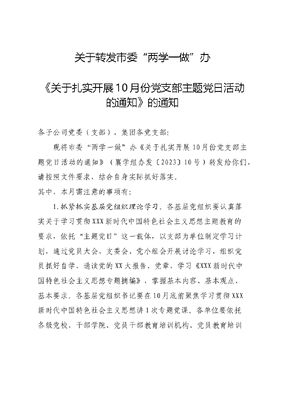 关于转发市委“两学一做”学习教育协调小组办公室关于扎实开展10月份党支部主题党日活动的通知.doc