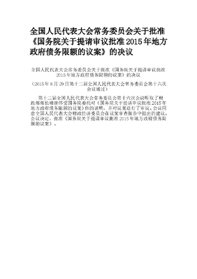 全国人民代表大会常务委员会关于批准《国务院关于提请审议批准2015年地方政府债务限额的议案》的决议.doc