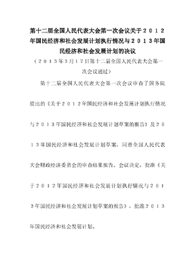 第十二届全国人民代表大会第一次会议关于2012年国民经济和社会发展计划执行情况与2013年国民经济和社会发展计划的决议.doc