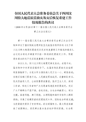 全国人民代表大会常务委员会关于四川汶川特大地震抗震救灾及灾后恢复重建工作情况报告的决议.doc