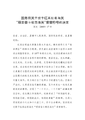 国务院关于授予红其拉甫海关“艰苦奋斗模范海关”荣誉称号的决定.docx