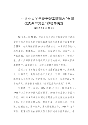 中共中央关于授予张富清同志“全国优秀共产党员”称号的决定.docx