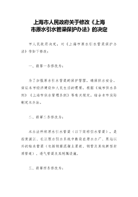 2018年上海市人民政府关于修改《上海市原水引水管渠保护办法》的决定.docx