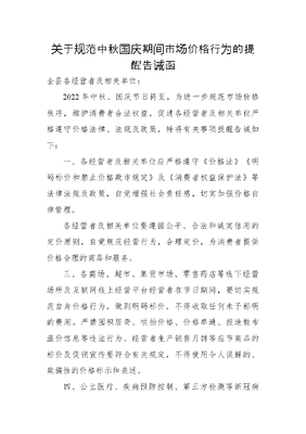 关于规范中秋国庆期间市场价格行为的提醒告诫函.docx