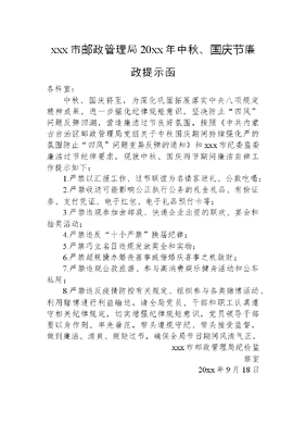 xxx市邮政管理局20xx年中秋、国庆节廉政提示函.docx