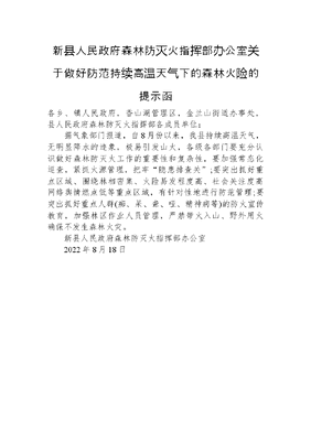 新县人民政府森林防灭火指挥部办公室关于做好防范持续高温天气下的森林火险的提示函.docx