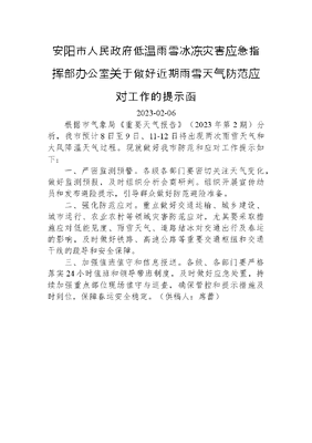 安阳市人民政府低温雨雪冰冻灾害应急指挥部办公室关于做好近期雨雪天气防范应对工作的提示函.docx