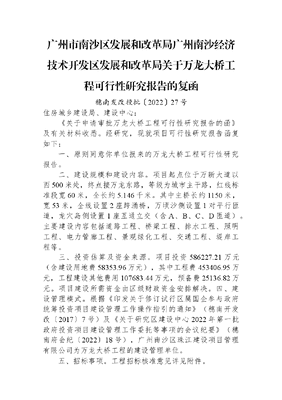 广州市南沙区发展和改革局+广州南沙经济技术开发区发展和改革局关于万龙大桥工程可行性研究报告的复函.docx