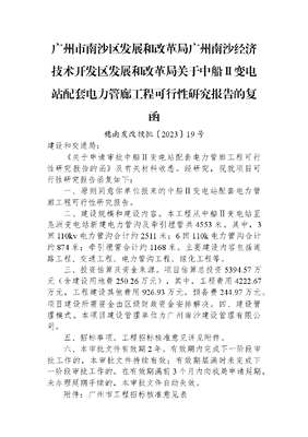 广州市南沙区发展和改革局+广州南沙经济技术开发区发展和改革局关于中船Ⅱ变电站配套电力管廊工程可行性研究报告的复函.docx
