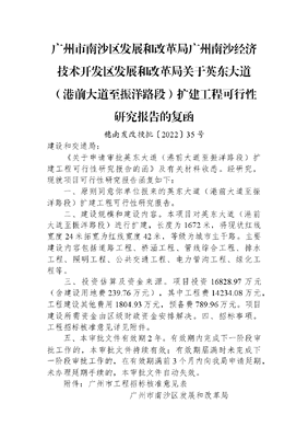 广州市南沙区发展和改革局+广州南沙经济技术开发区发展和改革局关于英东大道(港前大道至振洋路段)扩建工程可行性研究报告的复函.docx