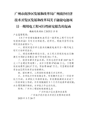 广州市南沙区发展和改革局+广州南沙经济技术开发区发展和改革局关于融捷电池项目一期用电工程可行性研究报告的复函.docx