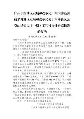 广州市南沙区发展和改革局+广州南沙经济技术开发区发展和改革局关于南沙新区公交站场建设(一期)工程可行性研究报告的复函.docx