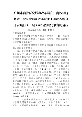 广州市南沙区发展和改革局+广州南沙经济技术开发区发展和改革局关于生物谷综合开发项目(一期)可行性研究报告的复函.docx
