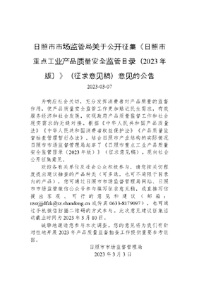 日照市市场监管局关于公开征集《日照市重点工业产品质量安全监管目录(2023年版)》(征求意见稿)意见的公告.docx