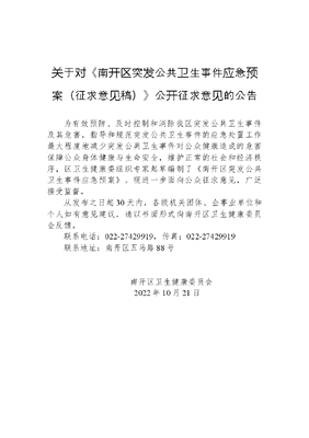 关于对《南开区突发公共卫生事件应急预案(征求意见稿)》公开征求意见的公告.docx