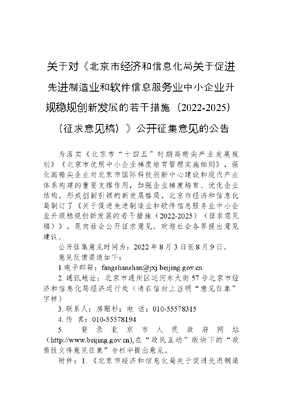 关于对《北京市经济和信息化局关于促进先进制造业和软件信息服务业中小企业升规稳规创新发展的若干措施(2022-2025)(征求意见稿)》公开征集意见的公告.docx