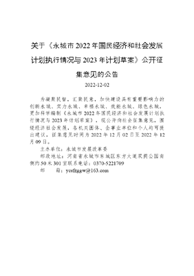 关于《永城市2022年国民经济和社会发展计划执行情况与2023年计划草案》公开征集意见的公告.docx