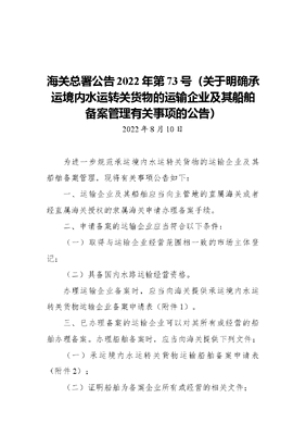 海关总署公告2022年第73号(关于明确承运境内水运转关货物的运输企业及其船舶备案管理有关事项的公告).docx