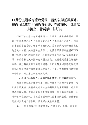 11月份主题教育廉政党课:落实以学正风要求,把改作风贯穿主题教育始终,在转作风、抓落实、讲担当、作贡献中带好头.docx