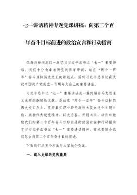 七一讲话精神专题党课讲稿:向第二个百年奋斗目标前进的政治宣言和行动指南.docx