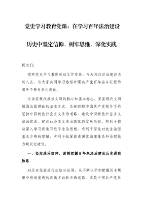 党史学习教育党课:在学习百年法治建设历史中坚定信仰、树牢思维、深化实践.docx
