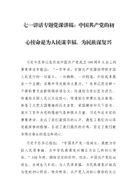 七一讲话专题党课讲稿:中国共产党的初心使命是为人民谋幸福、为民族谋复兴.docx