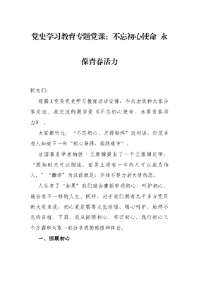 党史学习教育专题党课:不忘初心使命 永葆青春活力.docx