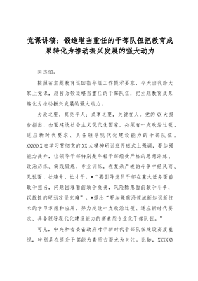 党课讲稿:锻造堪当重任的干部队伍 把教育成果转化为推动振兴发展的强大动力.docx