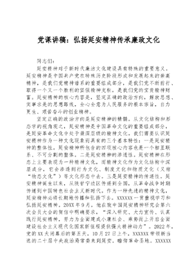 党课讲稿:弘扬延安精神传承廉政文化.docx