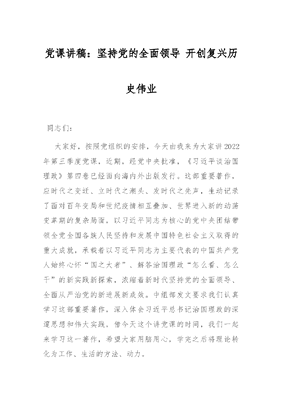 党课讲稿:坚持党的全面领导 开创复兴历史伟业.docx