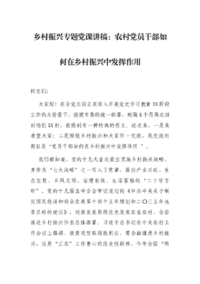 乡村振兴专题党课讲稿:农村党员干部如何在乡村振兴中发挥作用.docx